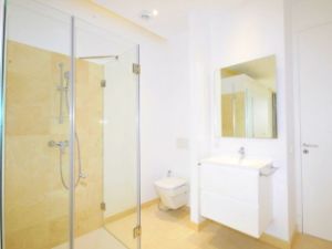 Die 100 m² große Wohnung im Erdgeschoss verfügt über 2,5 Schlafzimmer (2 Doppelzimmer), 2 Badezimmer mit Dusche, davon 1 Bad en Suite und eine moderne offene Küche (weiß) mit Geschirrspüler, Kühlschrank und Backofen (Bosch).