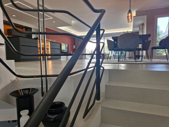 Herrliches neu saniertes Reihenhaus von 2022 mit 310 m² Wohnfläche und 240 m² Terrassen. Dieses Haus befindet sich in einer schönen ruhigen Anlage mit Pool und Liegewiese in Strandnähe Schöner offener Eingang, 4 Schlafzimmer, großer Wohn-Essraum mit offener Küche, 3 Bäder mit Dusche, Gäste WC, AC, Heizung (Gas), große Garage für 2 Autos, Abstellraum, Hobbyraum, Solaranlage. Jede Etage hat eine große Terrasse und von der Dachterrasse genießen Sie einen schönen Meerblick. 7 Min. zu Lokalen und zum Supermarkt. In der Nähe befinden sich Golfplätze, eine deutsche Schule und die  schöne Promenade zum Fahrradfahren oder um nach Arenal-Palma, vorbei an netten Strandbuchten zu laufen mit herrlichen Sonnenuntergängen. Schon fast zu perfekt für 1.2 Mio.!